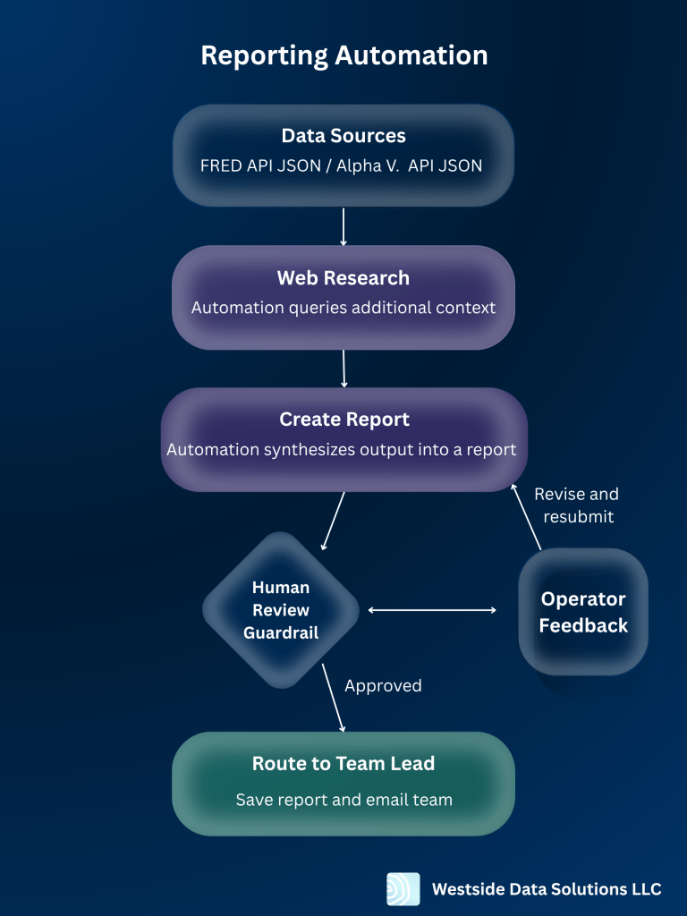 The Solution Westside Data Solutions designed and deployed an automated intelligence system that generates weekly macro preview reports using real-time economic data (FRED, Alpha Vantage), automates audience sentiment analysis to identify key content themes, and delivers curated news updates multiple times daily.